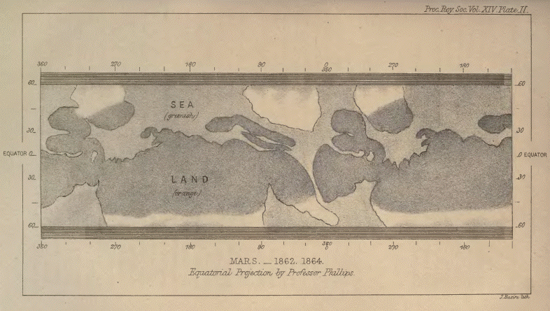 Phillips proseguì le osservazioni nel 1864, e pubblicò “Further Observations on the Planet Mars”, Proceedings of the Royal Society of London, 14 (1865) {A-0098.0014_.0000.18650000-0042_0046} p. 42-46 ➤ con una mappa di Marte (Plate II, dopo p. 52).1862). Confrontando le osservazioni del 1864 con quelle del 1862, individuò dei territori che si erano modificati, mentre una variazione di colore accompagnava la progressione o la regressione della calotta polare. Phillips aggiunse di aver notato l’evidente apparizione di macchie bianche, come se dei settori della superficie fossero stati ricoperti di ghiaccio o brina.
