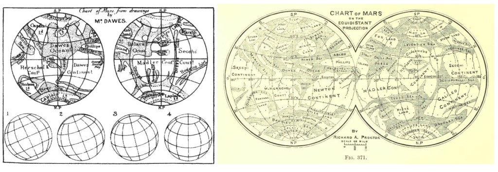 l lavoro di Dawes fu molto apprezzato, tanto che nel 1867 un altro astronomo inglese, Richard Henry Proctor (1837-1888) decise che dai suoi disegni si sarebbe potuto trarre una nuova mappa del pianeta; usò anche altri disegni non pubblicati per coprire i dettagli dell’emisfero nord che non erano favorevolmente visibili durante l’opposizione del 1864. La mappa fu pubblicata per la prima volta in “Half-hours with the telescope; being a popular guide to the use of the telescope as a means of amusement and instruction” (1868) (sopra a sinistra). Dall’edizione del 1873 :