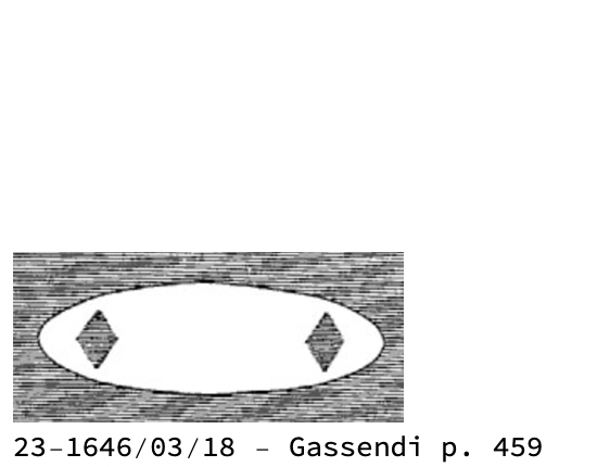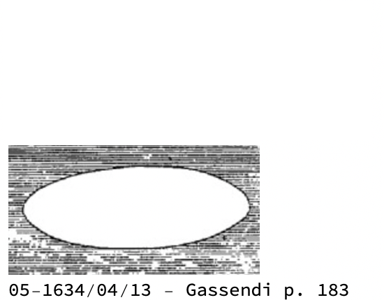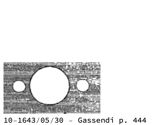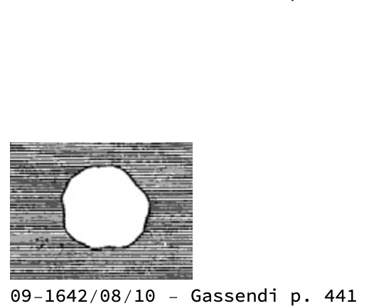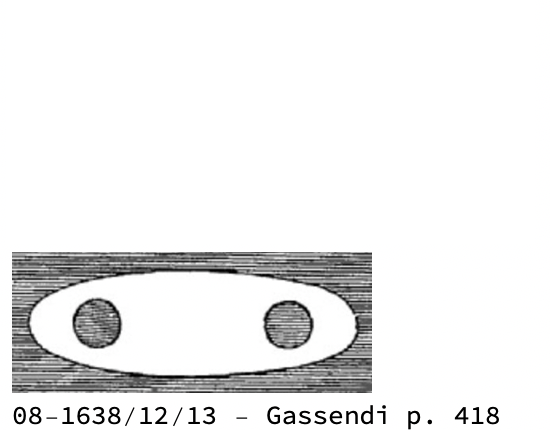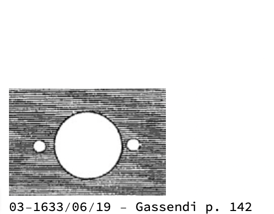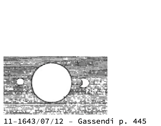 La figura ➤ contrasta la descrizione del “bozzolo”. In effetti, l’anello era molto aperto, e Gassendi deve averlo visto come una figura ovale; non avendo confidenza con una forma del genere, lo disegnò trisferico. L’anno dopo (13.04.1634), al contrario, disegnò un vistoso ovale p. 183 ➤ ; il 20.11.1636 disegnò una forma simile all’anello che conosciamo p. 362 ➤ ; il 13.12.1638 disegnò una forma molto allungata p. 418 ➤ . Mentre l’aspetto “rotondo” o “solitario” di Saturno nel 1626 fu osservato da pochi, la fase rotonda del 1642 causò un grande interesse. Ecco il commento di Gassendi (10.8.1642):