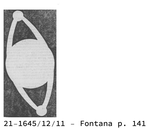 In {B-0023.00_.1646} “Novae coelestium et terrestrium rerum Observationes” ➤ Francesco Fontana pubblicò le sue osservazioni di Saturno (fra il 1630 e il 1645). Tuttavia, prima di questa data, circolarono in Italia (e anche oltralpe) dei suoi disegni. In fondo alla pagina, una sua osservazione del 1636. Lui sfoggiava delle forme mai viste, affermando che solo i suoi perfezionati cannocchiali permettevano di vedere il vero aspetto del pianeta. Il clamore causato dalla notizia di queste osservazioni crebbe, e anche Antonio Santini, amico di Galileo, rimase impressionato; inviò delle riproduzioni del disegno di Saturno: