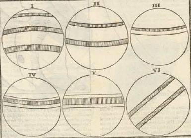 {B-0031.00_.1659} p. 6 ➤ In secondo luogo, per quanto concerne le zone o bande scorte su Giove da alcuni osservatori e che non presentano sempre la stessa apparenza, le abbiamo visto spesso, io e quelli che prendevano parte alle mie osservazioni, più luminose del resto di Giove, benché gli altri affermino che siano più scure: forse lo spazio situato fra queste zone più luminose è sembrato loro come una zona più scura. Ora, nel 1656 abbiamo osservato queste zone ad una distanza fra di loro molto più grande che nei tre anni seguenti, come si vede nelle figure allegate. Forse da tale instabilità non concluderemo a torto che, similmente alle nostre nubi, certi vapori occupino l’etere vicino a Giove e si formino in maggiore quantità ora ad una e ora ad altra latitudine.