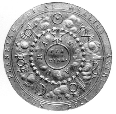 In questa vicenda assume un ruolo particolare la figura del gesuita Maximilian Hell, direttore dell’Osservatorio di Vienna. Egli adottò il nome “Urania” (non “Urano”), introducendolo nelle “Ephemerides Astronomicae Anni 1787 ad meridianum vindobonensem” (1786) (vedere da dopo p. 88 ➤); il simbolo era formato da un globo, sormontato da una stella. Hell accettò l’associazione del nuovo pianeta al platino, e tramite la Göttinger Societät der Wissenschaften fece coniare una medaglia commemorativa di questo metallo. Nelle dette effemeridi pubblicò un carme dedicato ad Herschel; gli doveva una riparazione, per aver rimpiazzato il nome Georgian Planet. Hell nel 1789 offrì ad Herschel e al suo Re due nuove costellazioni: Psalterium Georgii (Arpa di Giorgio) e Telescopium (Tubus) Herschelii (telescopio di Herschel) ➤; Bode le inserì nel suo atlante stellare.