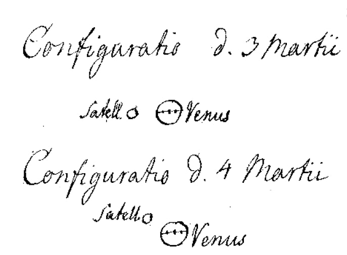 11 marzo 1764. Quella sera, fra le le 5 ¾ e le 7 vedemmo tutti con il tubo da 9.5 piedi una luce debole a destra di Venere a circa 30* sopra l’orizzontale di Venere. Quella luce (non apparivano stelle fisse simili nel tubo) era di colore simile a Venere, per cui tutti credemmo che fosse il satellite di Venere. Tentammo in molti modi di vedere se fosse una luce fittizia, che appariva nel tubo, ma trovammo il contrario. Il colore di questa luce era simile, a quella che era apparsa a Peter Horrebow il 9 marzo, ma molto inferiore. Distava da Venere 1 o ¾ diametri di Venere. Sparì alle ore 7.